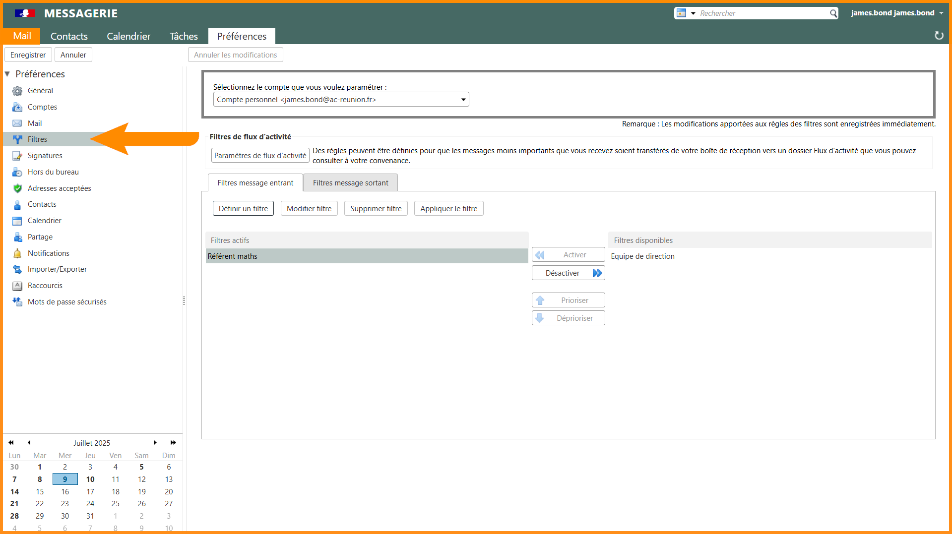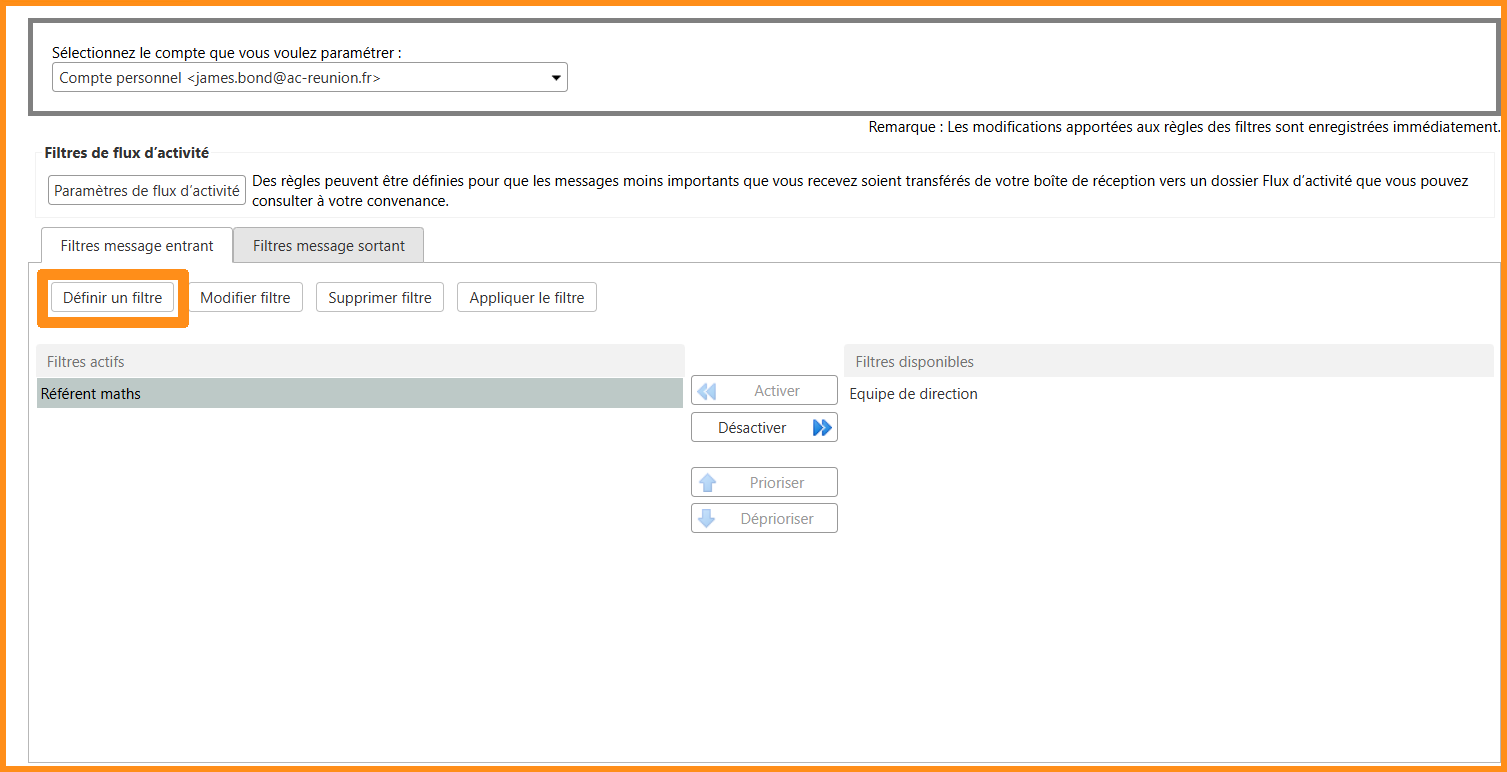 messagerie nationale Zimbra, cliquez sur "Définir un filtre".