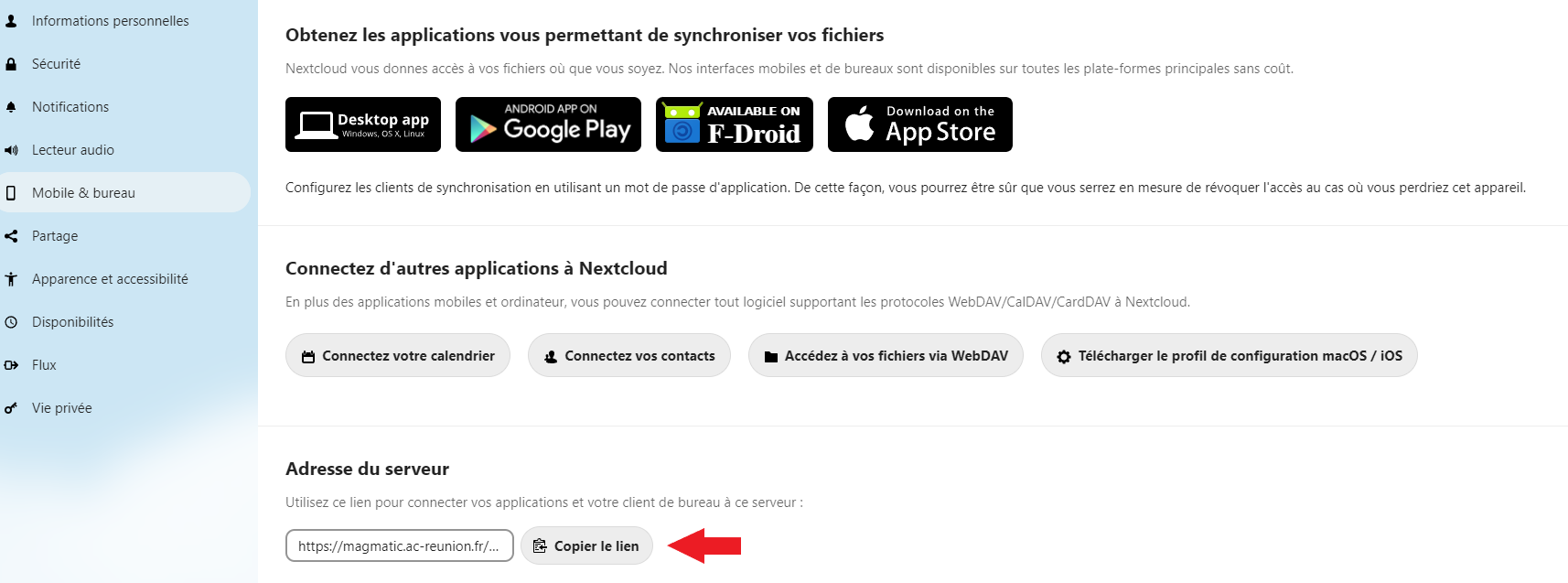 Etape 2 : Accès à l'espace NextCloud Académique de l'utilisateur. (Disponible sur votre espace Métice)