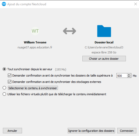 Etape 5 : Revenir sur l'application NextCloud, et mettre les paramètres suivants comme sur l'image ci-dessous puis appuyer sur "Connexion". Les fichiers disponibles sur votre espace Nuage seront disponibles en local sur votre poste même hors connexion internet.