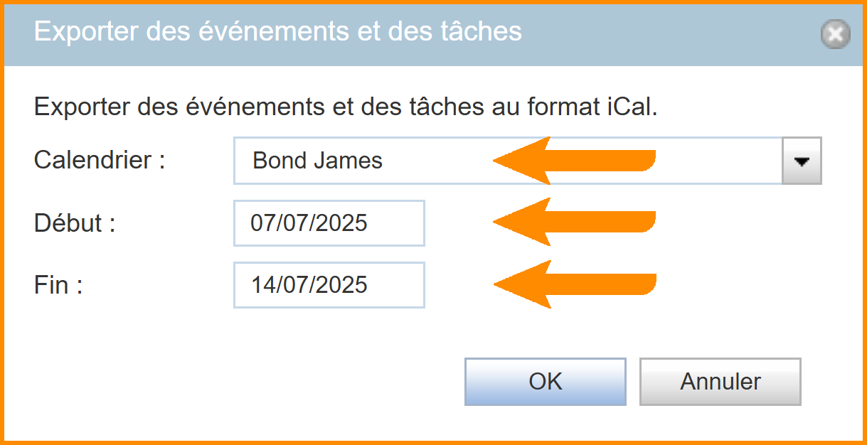 L’exportation devra être effectuée pour chacun des calendriers que vous possédez. Dans les exemples ci-dessous, nous illustrerons la procédure avec les calendriers de Bond James et Leiter Felix.