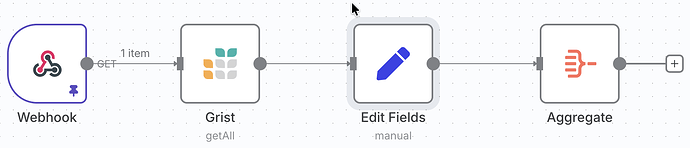 Le nœud suivant est de type Data Transformation > Edit Fields : c’est la couche de normalisation. Grâce à lui, chaque colonne provenant de Grist sera renommée, typée, et éventuellement convertie (texte, booléen, liste, coordonnées, etc.) pour correspondre exactement à la structure attendue par GoGoCarto. Paramétrez ce nœud en fonction du modèle de données que vous voulez définir.