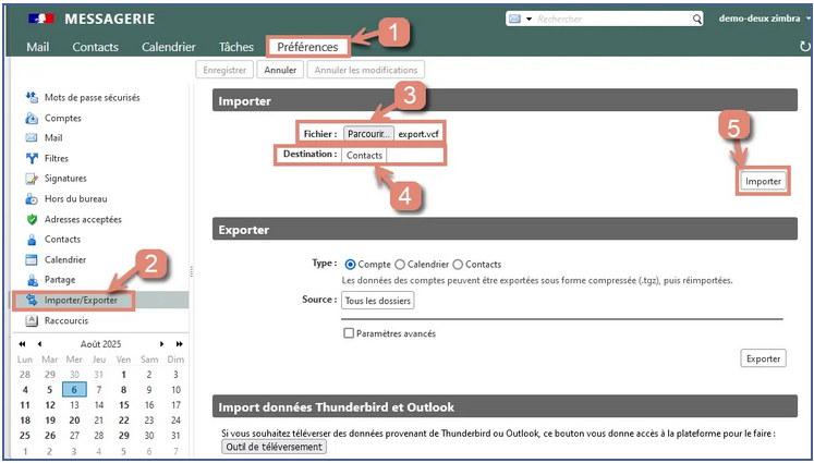 Les fichiers de contacts et de calendriers peuvent être envoyés par message électronique à l’adresse de la boîte fonctionnelle concernée.