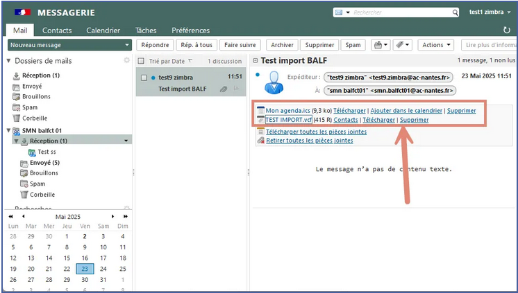 À la réception du message, l’interface de messagerie permet d’intégrer le contenu du fichier dans le compte de la boîte fonctionnelle :