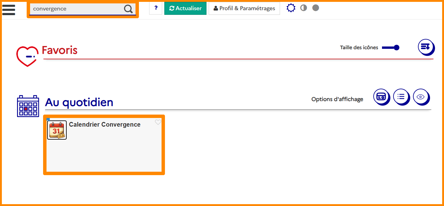 • En haut à gauche, tapez dans la barre de recherche "convergence" et cliquez sur "icon_convergence_old.png Calendrier Convergence".