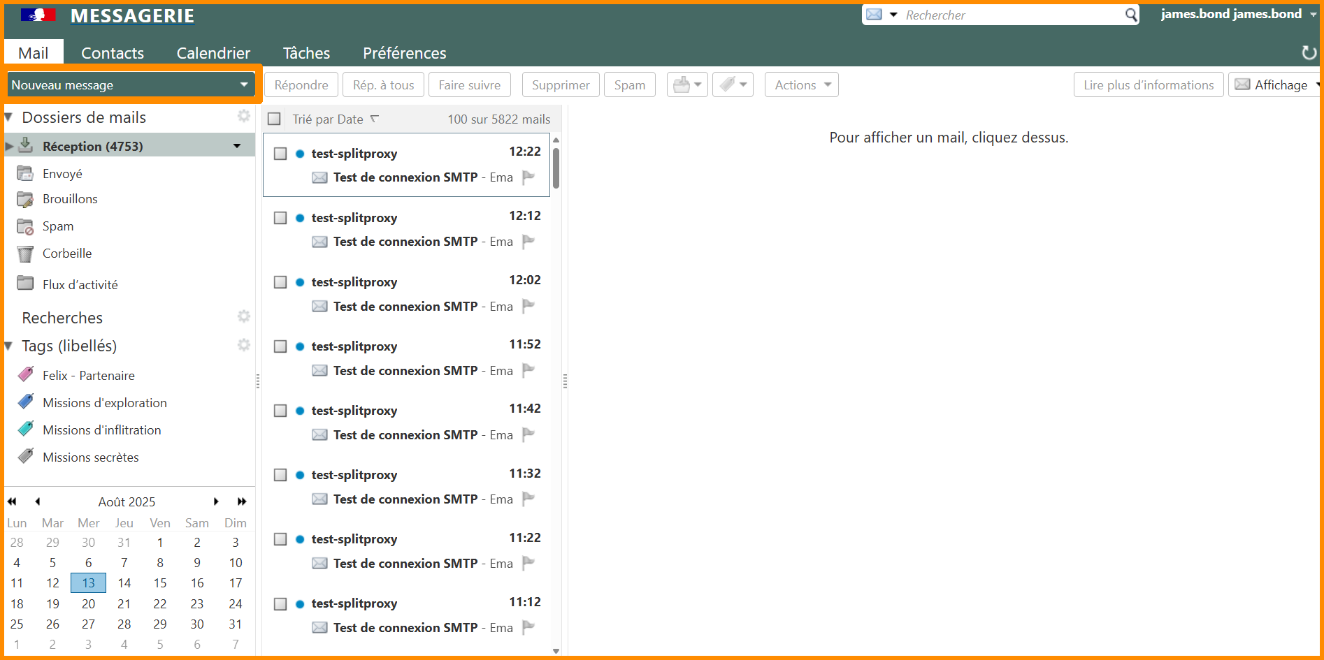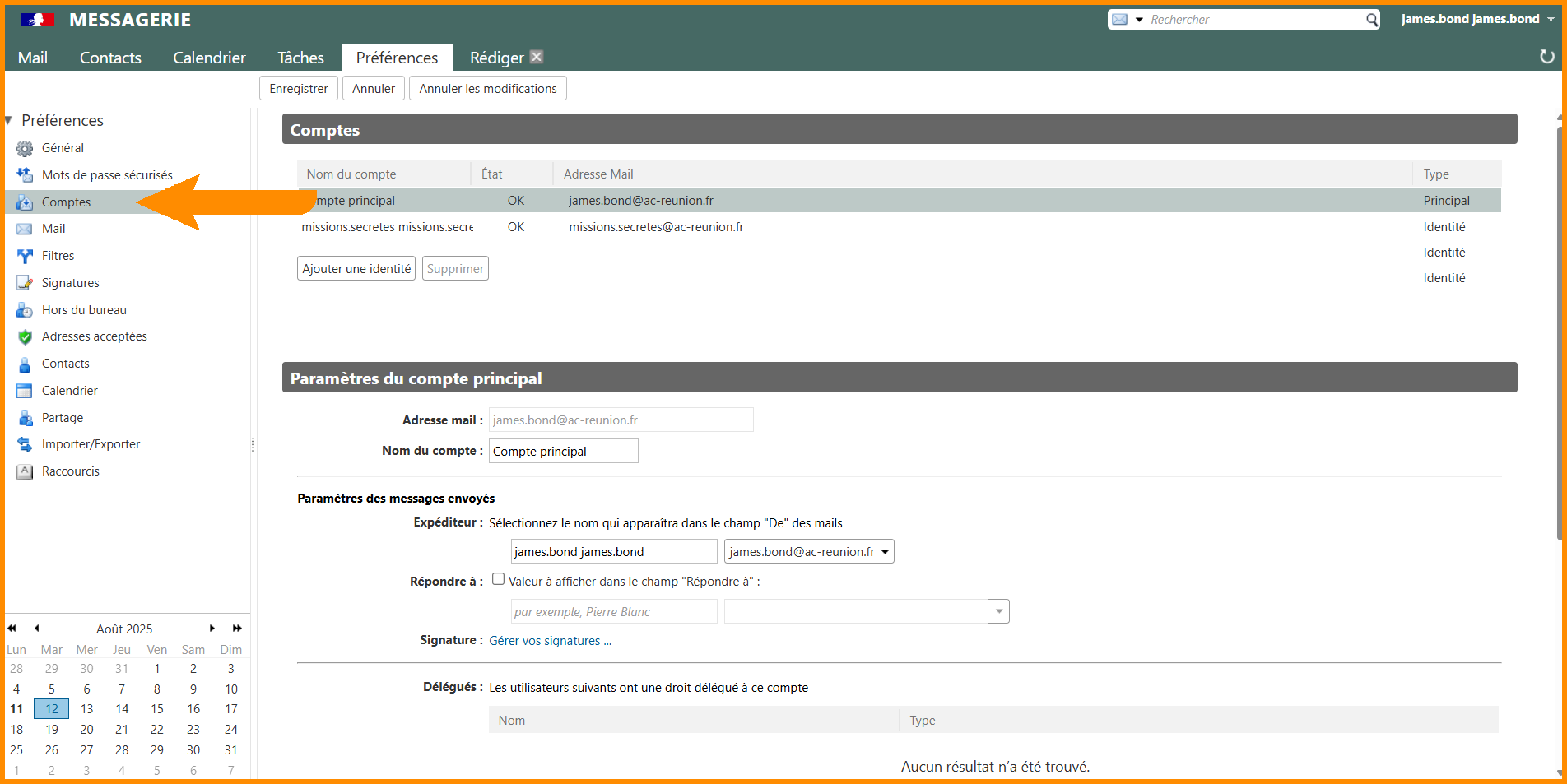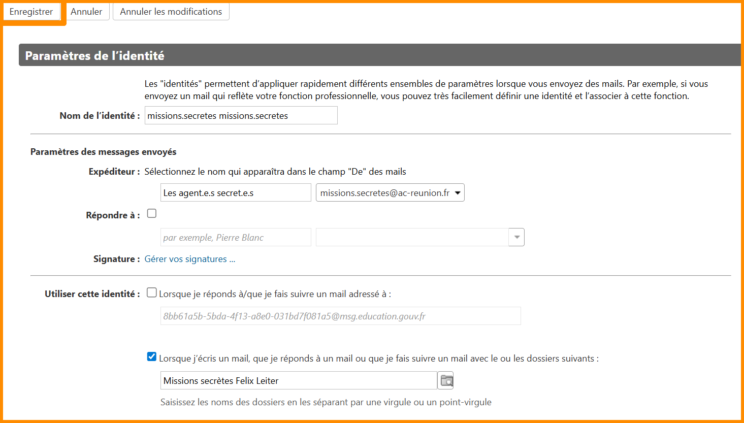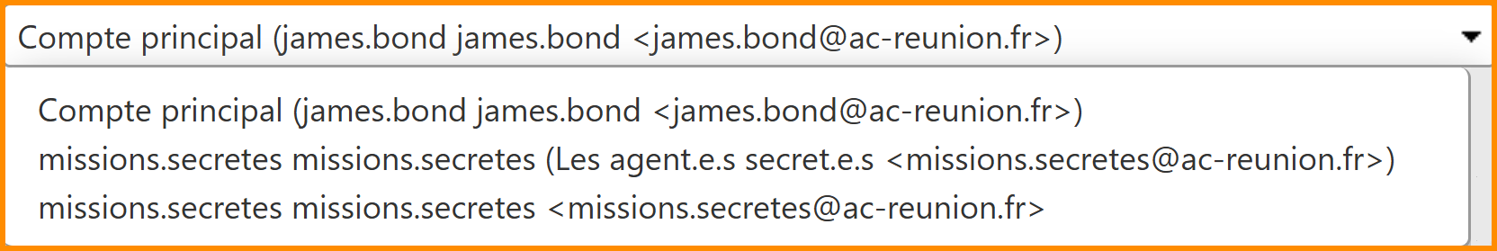 L'adresse mail de la boîte fonctionnelle partagée apparait en double. L'une correspond à l'adresse avec une identité personnalisée, et l'autre à celle sans personnalisation du nom (dans la capture d'écran ci-dessus, celle avec le nom personnalisé est "Les agent.e.s secret.e.s").