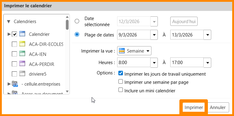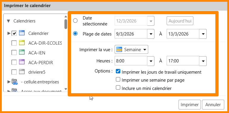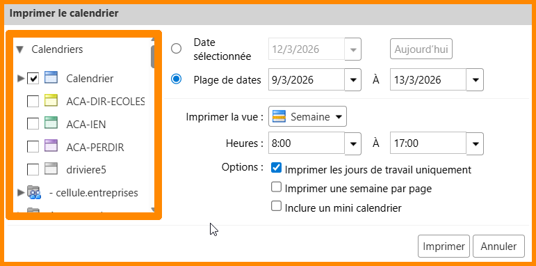 • À gauche, sélectionnez les calendriers que vous souhaitez imprimer.