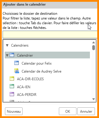 • Une fenêtre s'ouvre, sélectionnez un calendrier ou cliquez en bas à gauche sur "Nouveau" selon l'architecture de vos calendriers.