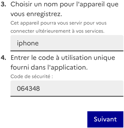 - Pour finaliser le paramétrage TOTP, définissez et saisissez le nom de votre appareil.