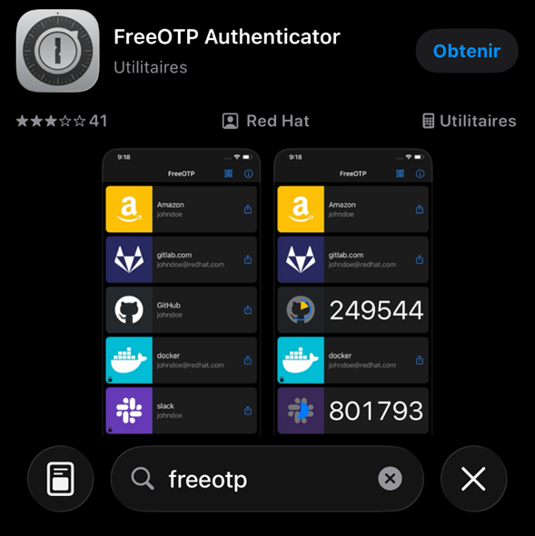 - Munissez vous de votre second smartphone, puis dans votre application de store (App Store pour IOS ou Play Store pour Android) cherchez l'application "FreeOTP Authenticator"