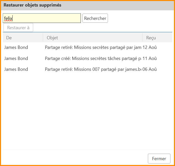 - Recherchez le dossier que vous voulez suivre. Vous pouvez rechercher par le nom du dossier ou l'adresse mail de la personne propriétaire du dossier.
