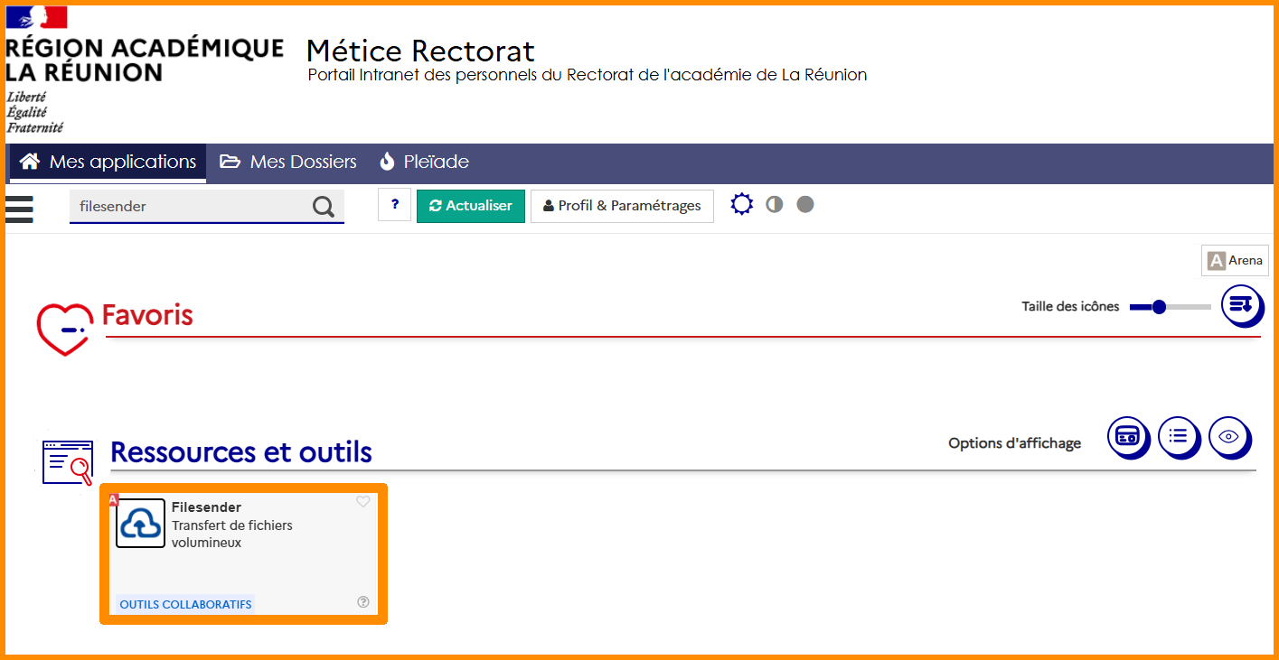 - En haut à gauche, tapez dans la barre de recherche "filesender" et cliquez sur "