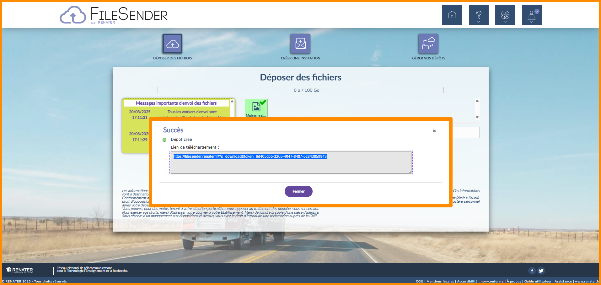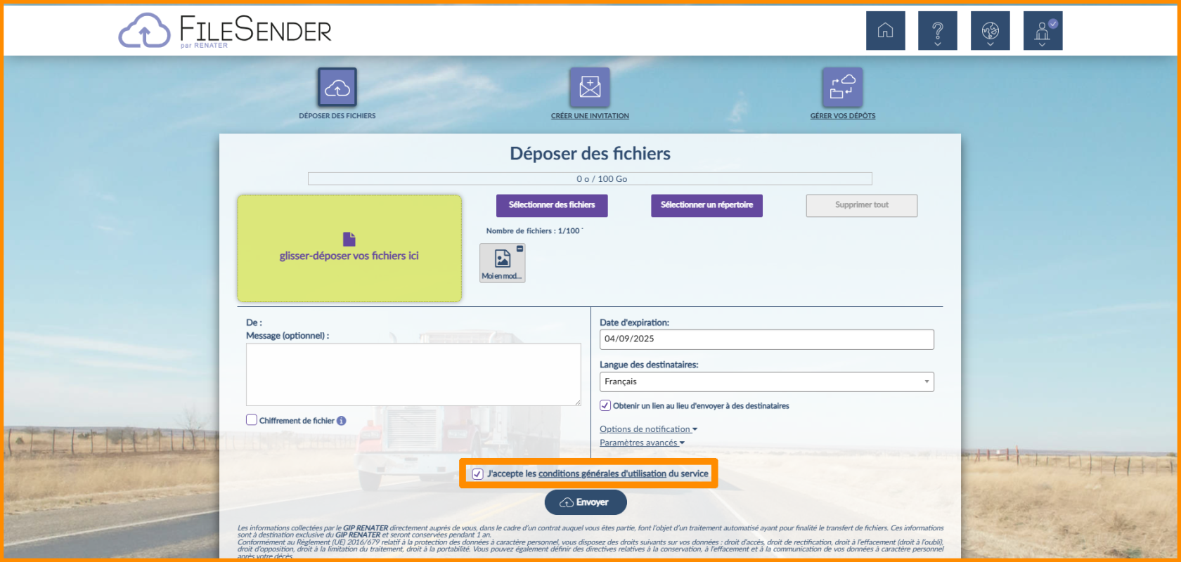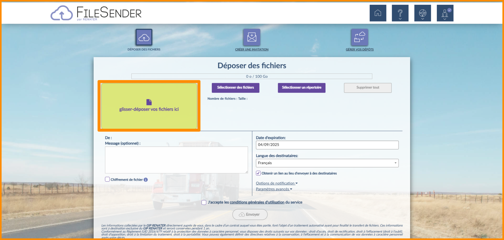 - Glissez les fichiers à transférer dans la case "glisser-déposer vos fichiers ici".
