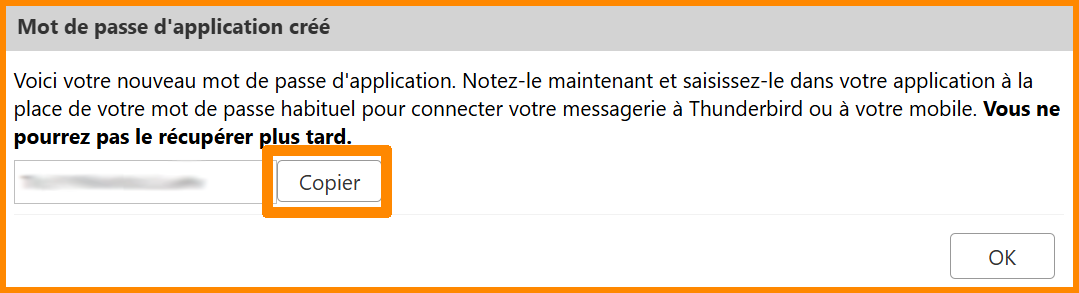 - Une nouvelle fenêtre s'ouvre avec le mot de passe d'application. Cliquez sur "Copier".