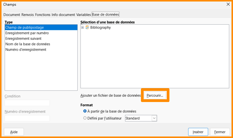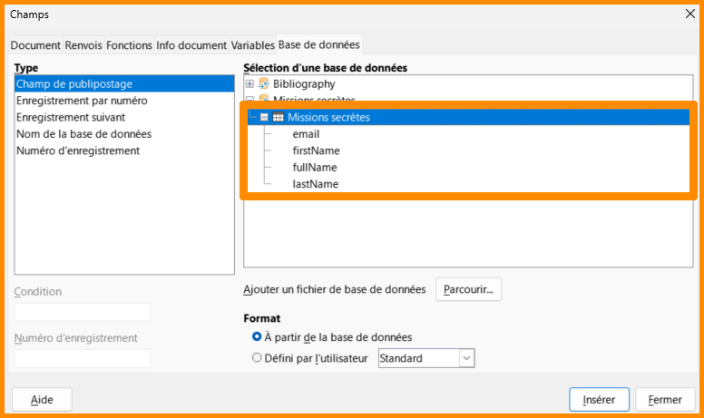 - Cliquez sur le champ qui vous intéresse puis sur "Insérer". Le champ s'affiche sur votre document texte en surligné gris et entouré de crochets.