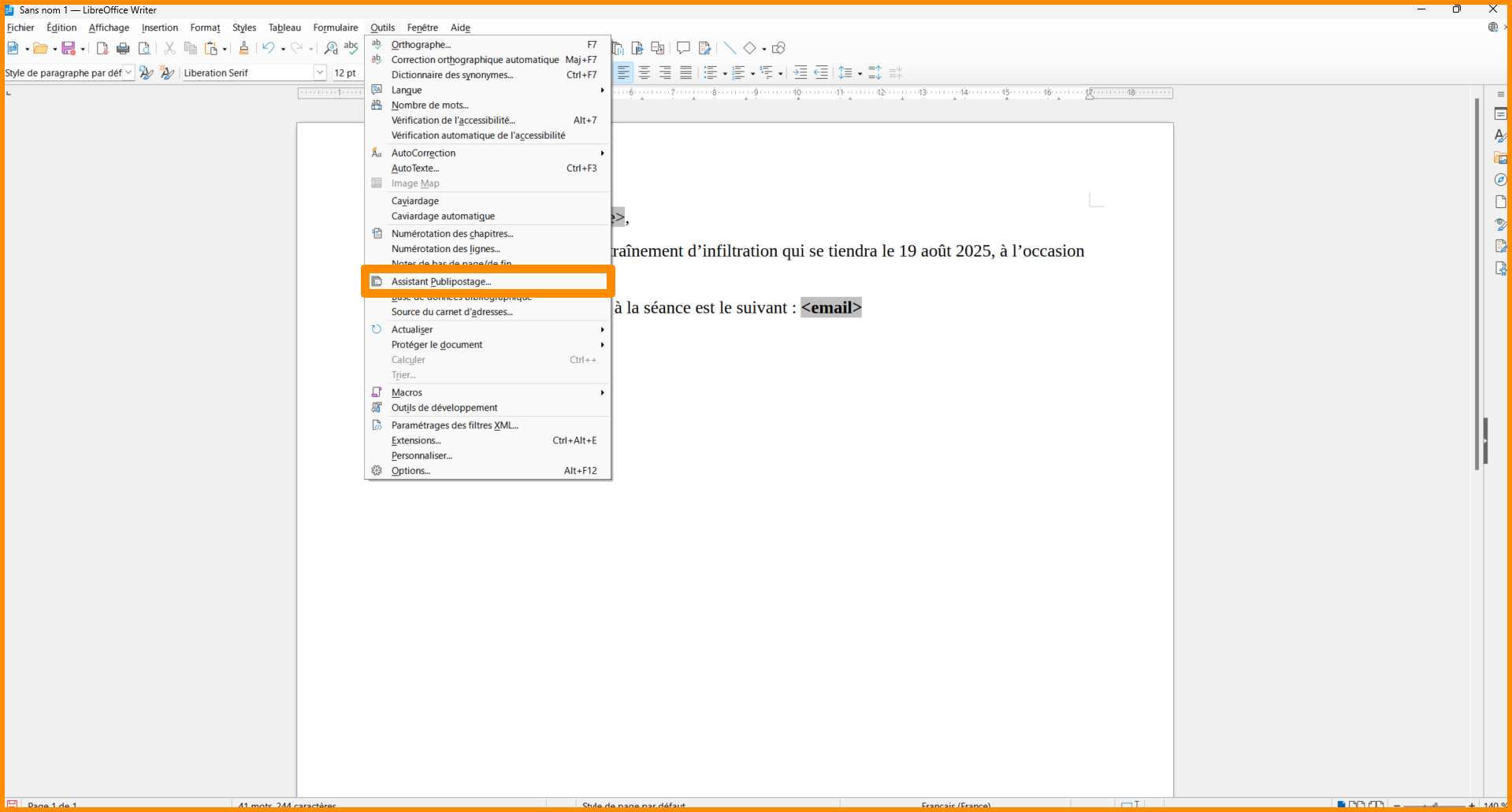 - Cliquez sur "Outils", puis sur "Assistant Publipostage"