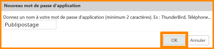 - Une nouvelle fenêtre s'ouvre, nommez votre prochain mot de passe (ex : Publipostage).