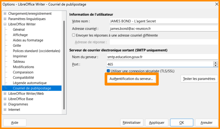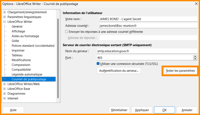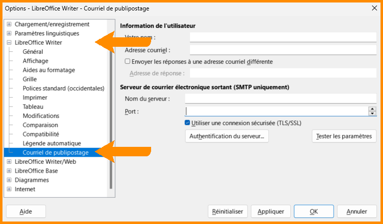 - À gauche, dans la catégorie "LibreOffice Writer", cliquez sur "Courriel de publipostage".
