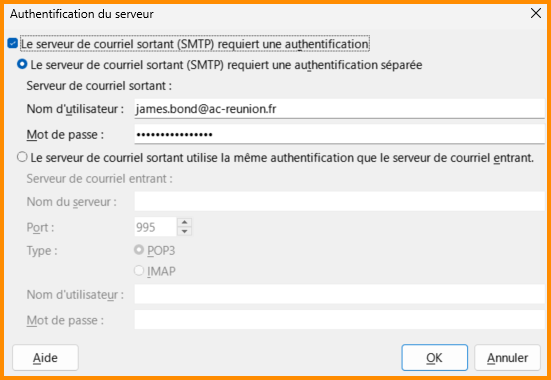 - Cliquez sur "Le serveur de courriel sortant "SMTP" requiert une authentification séparée".