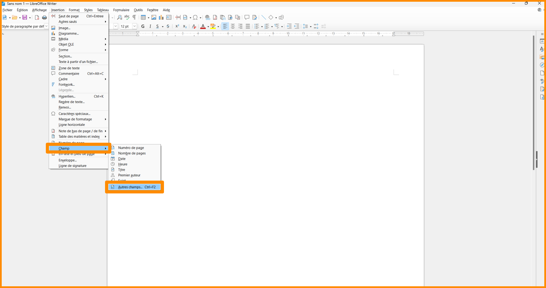 - Cliquez sur "Insertion", puis sur "Champ", puis sur "Autre champ".