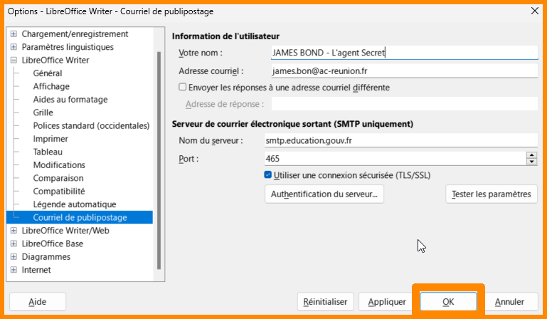 - À gauche, dans la catégorie "LibreOffice Writer", cliquez sur "Courriel de publipostage".